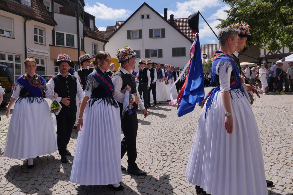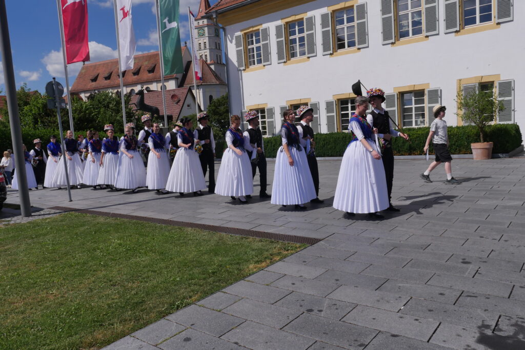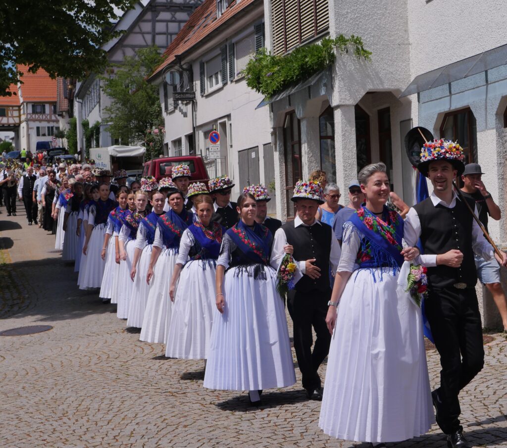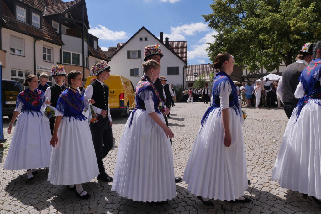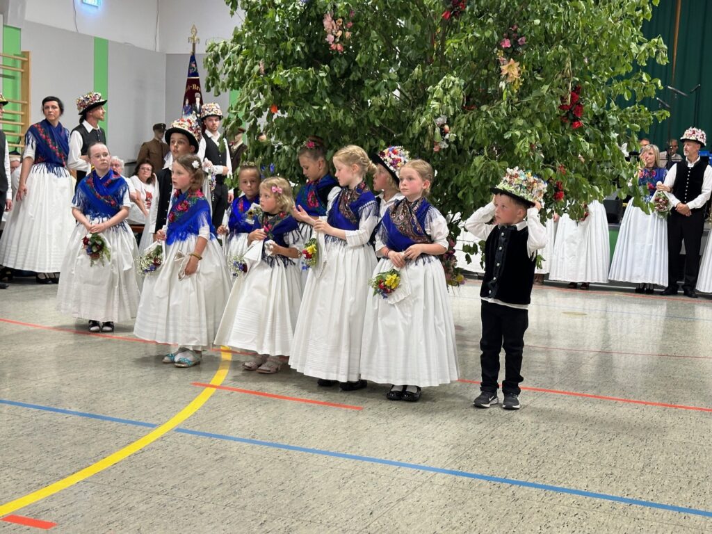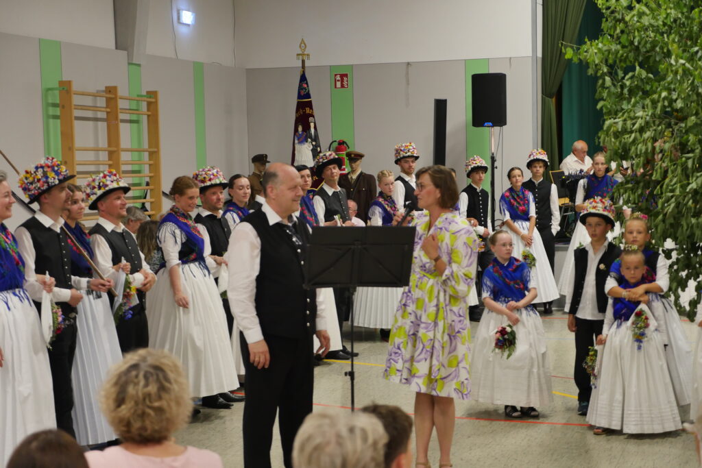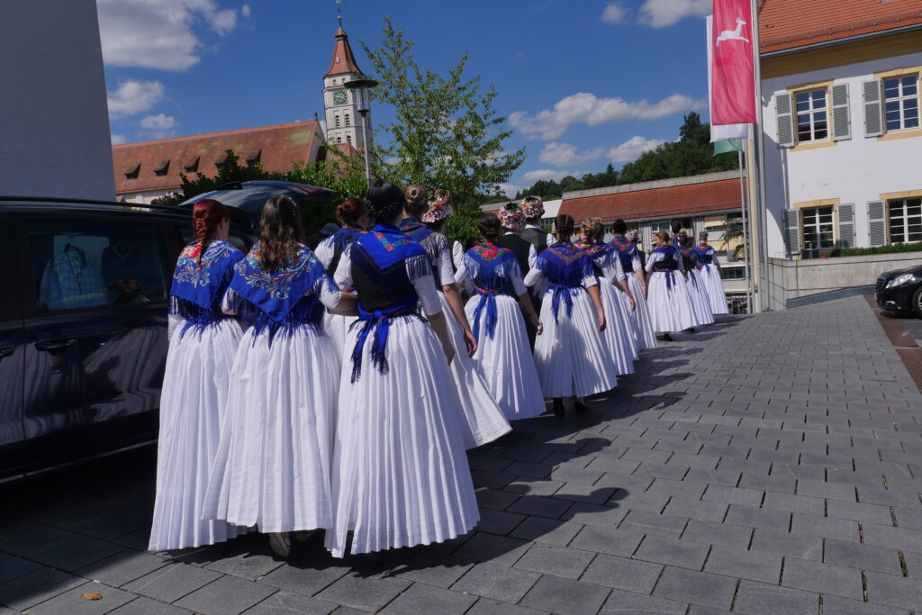 Den festlichen Trachtenzug führte Fahnenträger Raphael Stuhl an, gefolgt von den Trachtenkindern sowie dem Vortänzerpaar Ines Rieger und Maximilian Kupi. Musikalisch begleitet wurde der Umzug von der Original Banater Schwabenkapelle unter der Leitung von Peter Pohl. Die vertraute Mischung aus strahlend weißen Röcken, blauen Tüchern und den klassischen „geputzten“ Hüten, untermalt von der bekannten Marschmusik, sorgte für eine festliche Atmosphäre.