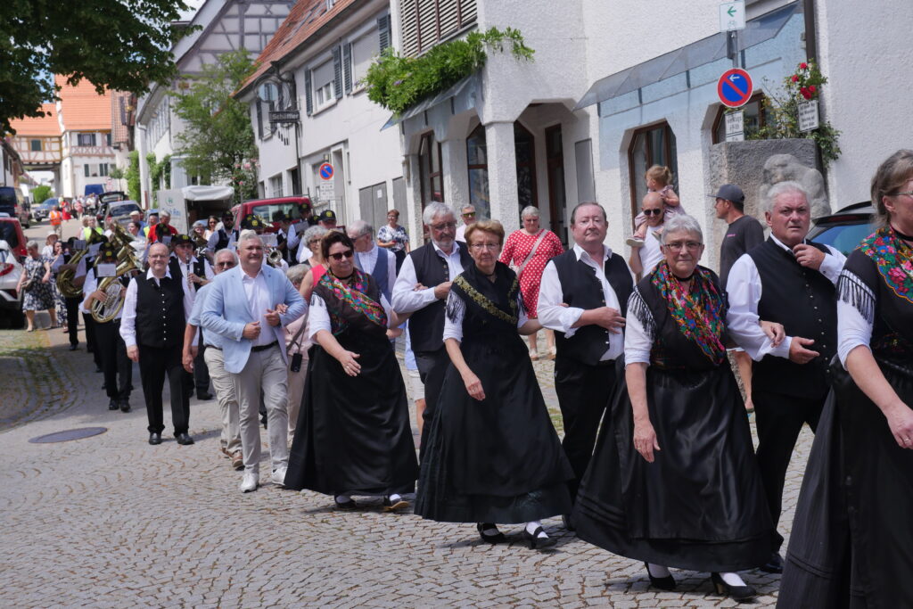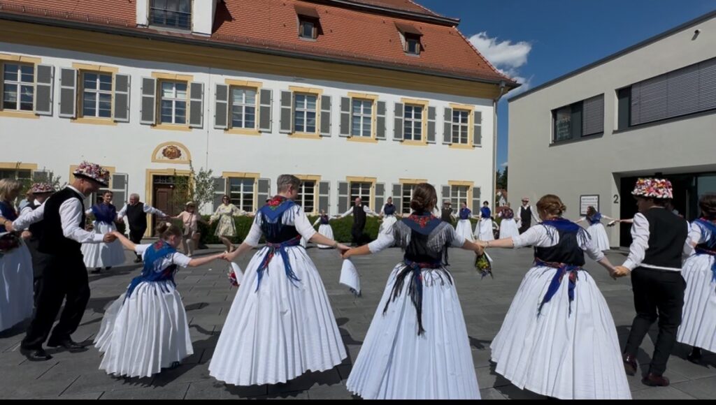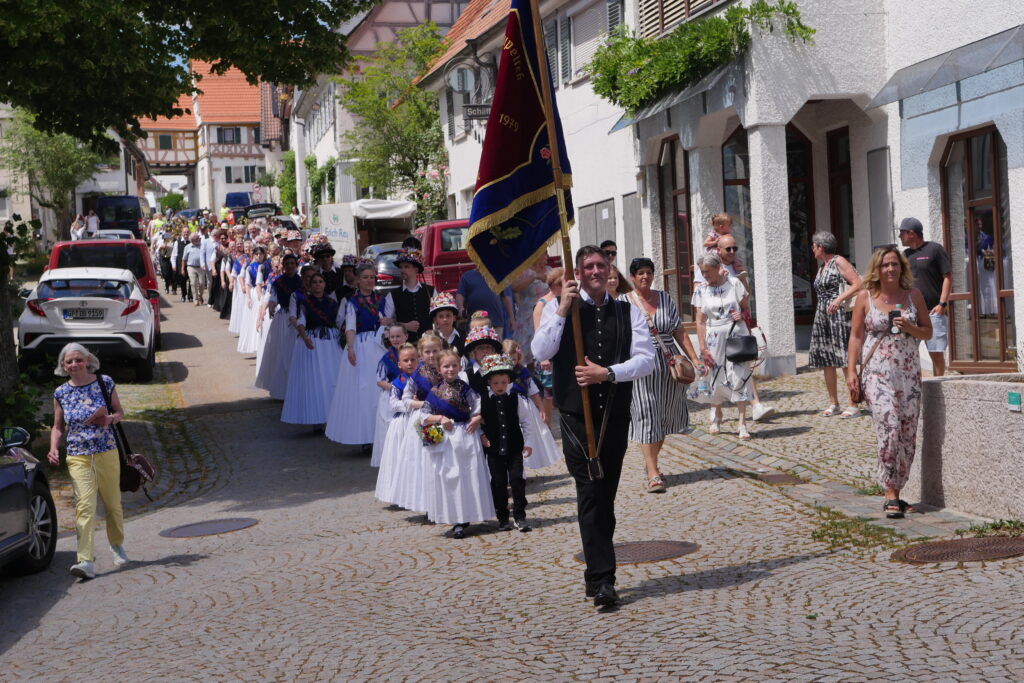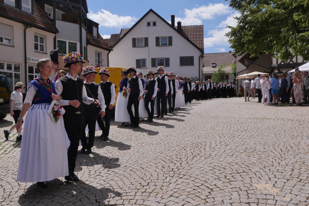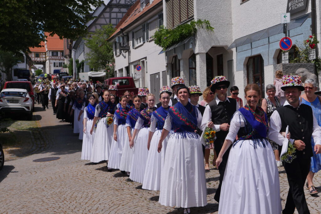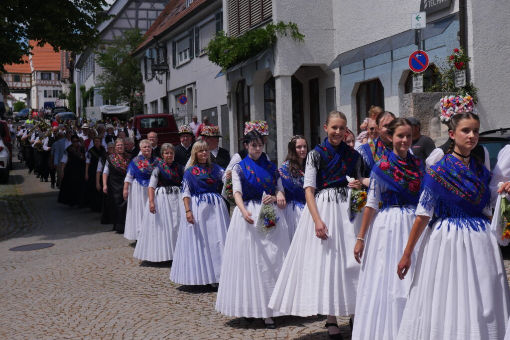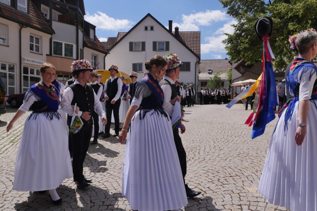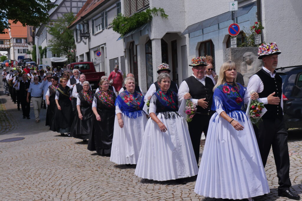 Den festlichen Trachtenzug führte Fahnenträger Raphael Stuhl an, gefolgt von den Trachtenkindern sowie dem Vortänzerpaar Ines Rieger und Maximilian Kupi. Musikalisch begleitet wurde der Umzug von der Original Banater Schwabenkapelle unter der Leitung von Peter Pohl. Die vertraute Mischung aus strahlend weißen Röcken, blauen Tüchern und den klassischen „geputzten“ Hüten, untermalt von der bekannten Marschmusik, sorgte für eine festliche Atmosphäre.