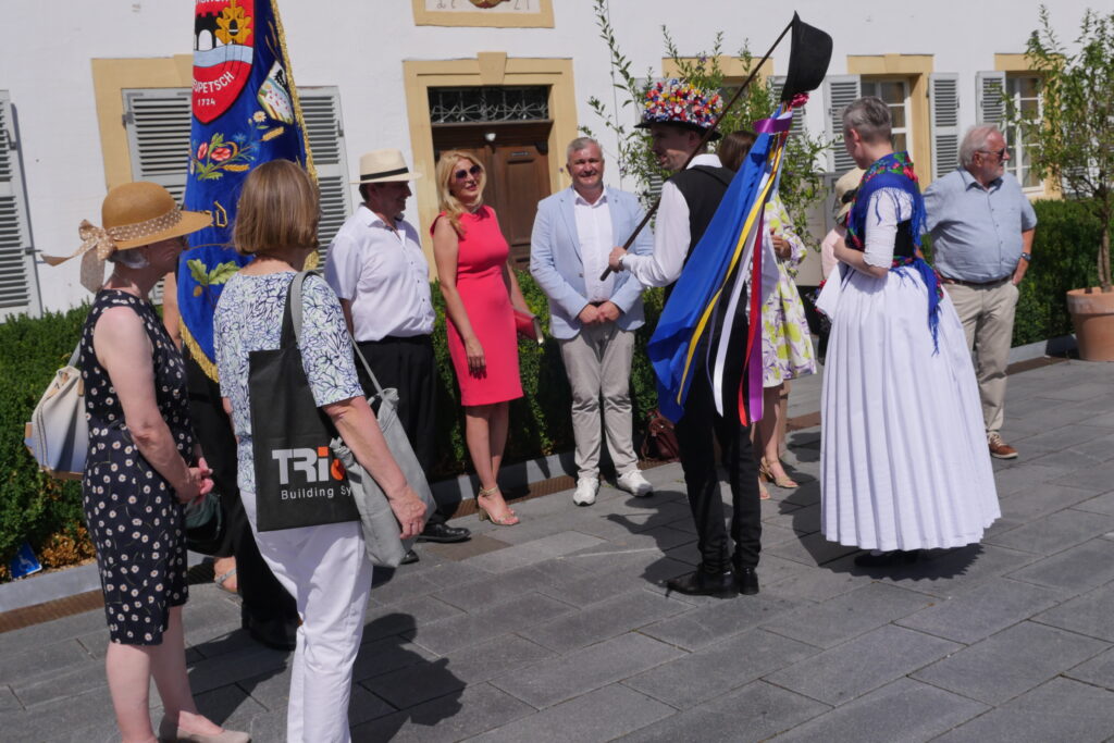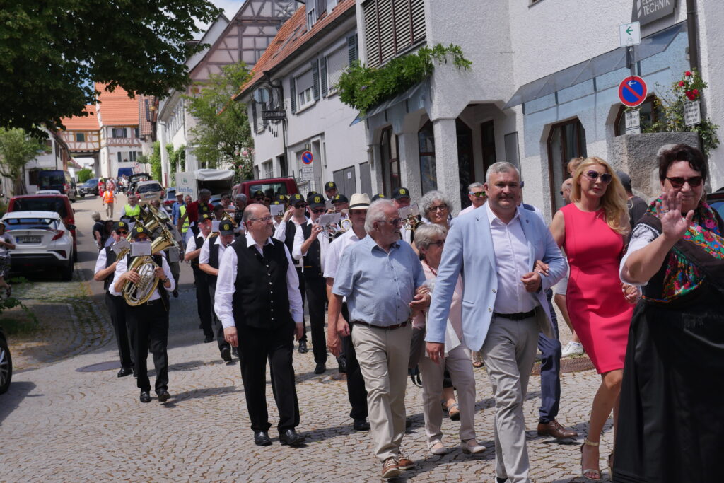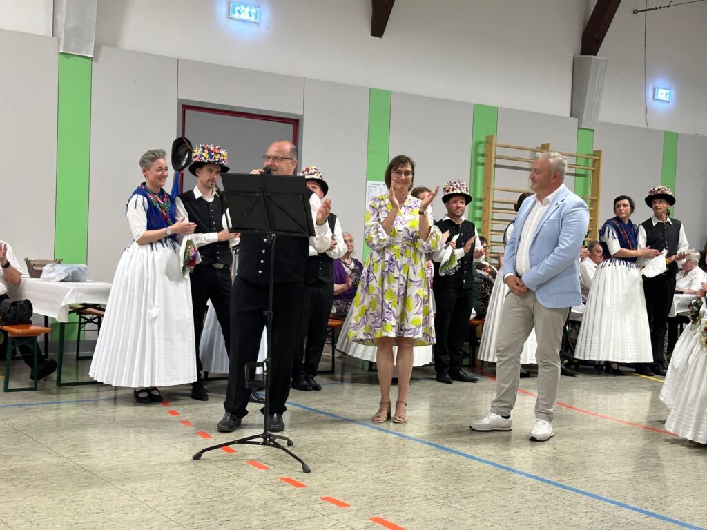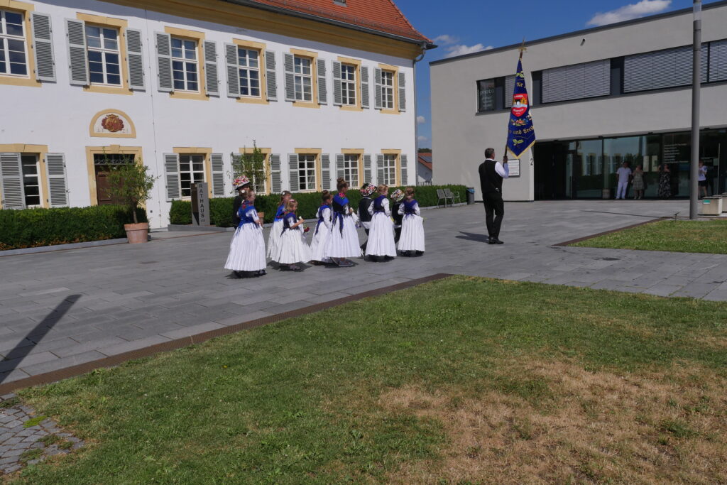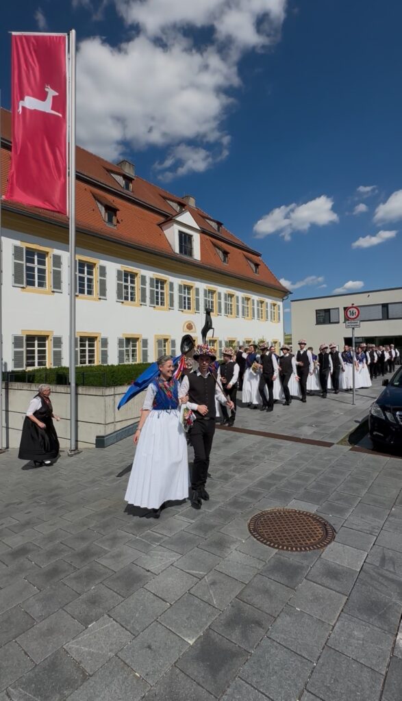 Der Zug setzte sich dann in Richtung Rathausplatz in Bewegung, wo auch Bürgermeisterin Claudia Dörner, stellvertretend für alle Bürger der Gemeinde, willkommen geheißen wurde. Die Blaskapelle begleitete diesen feierlichen Moment und führte anschließend den Trachtenzug zur Festhalle, in der die Gäste bereits warteten.