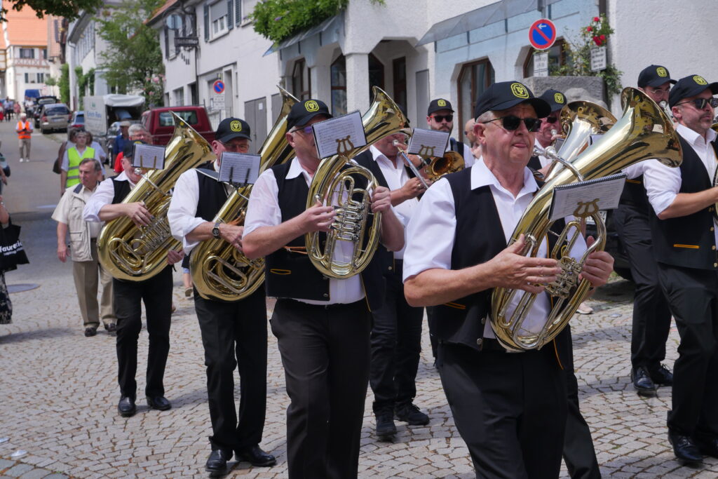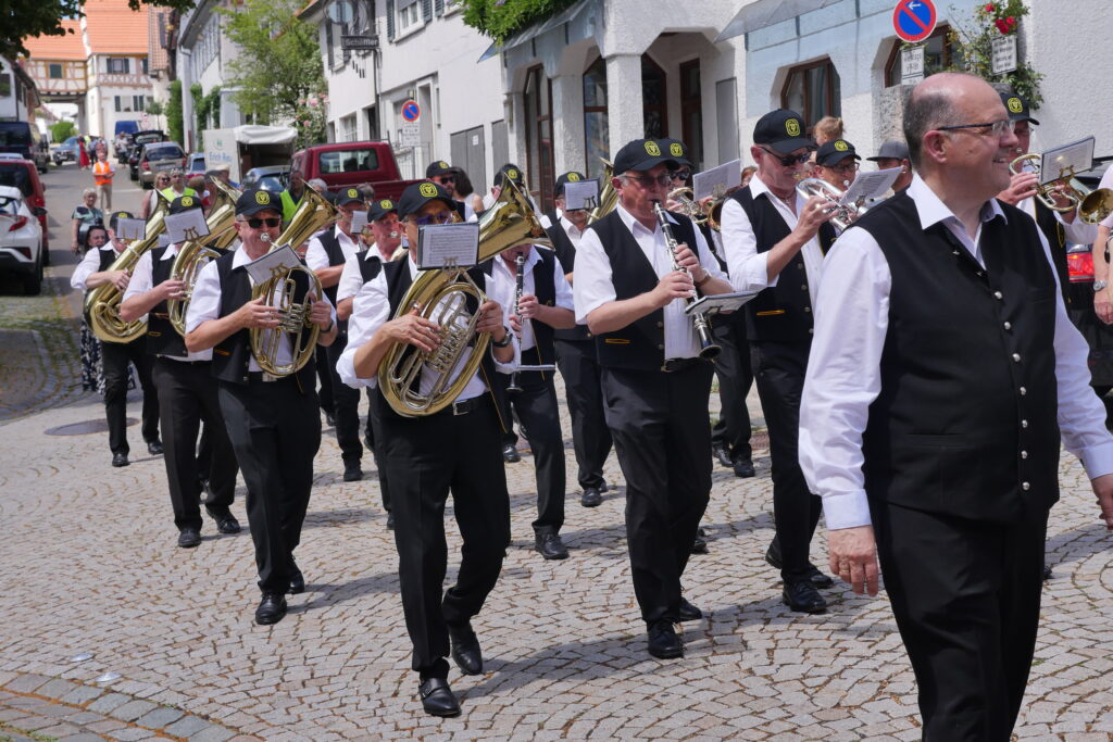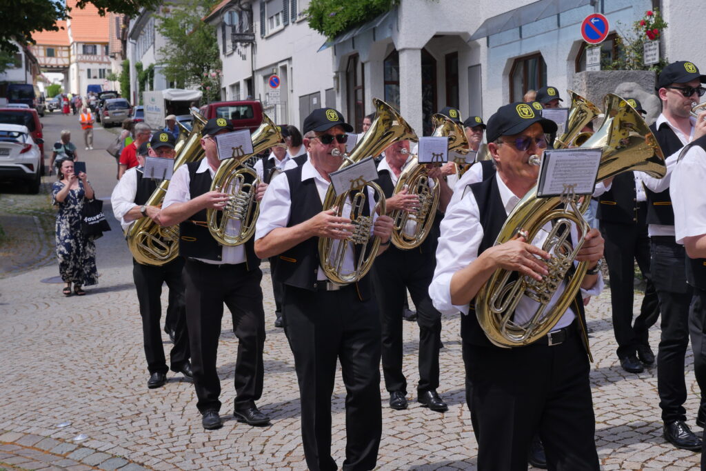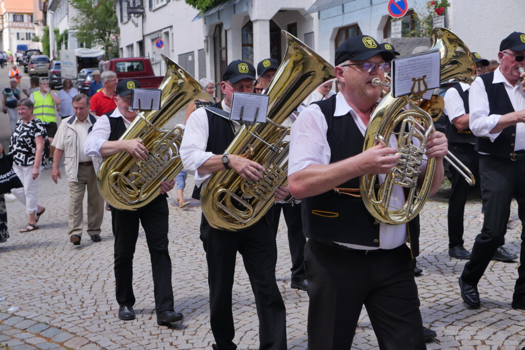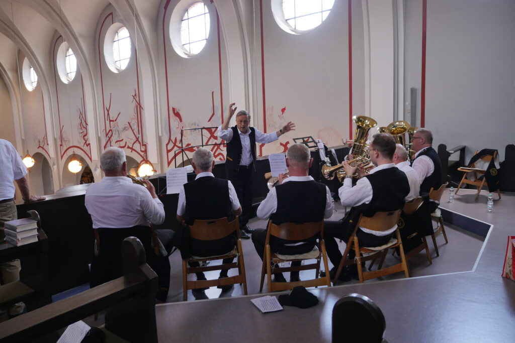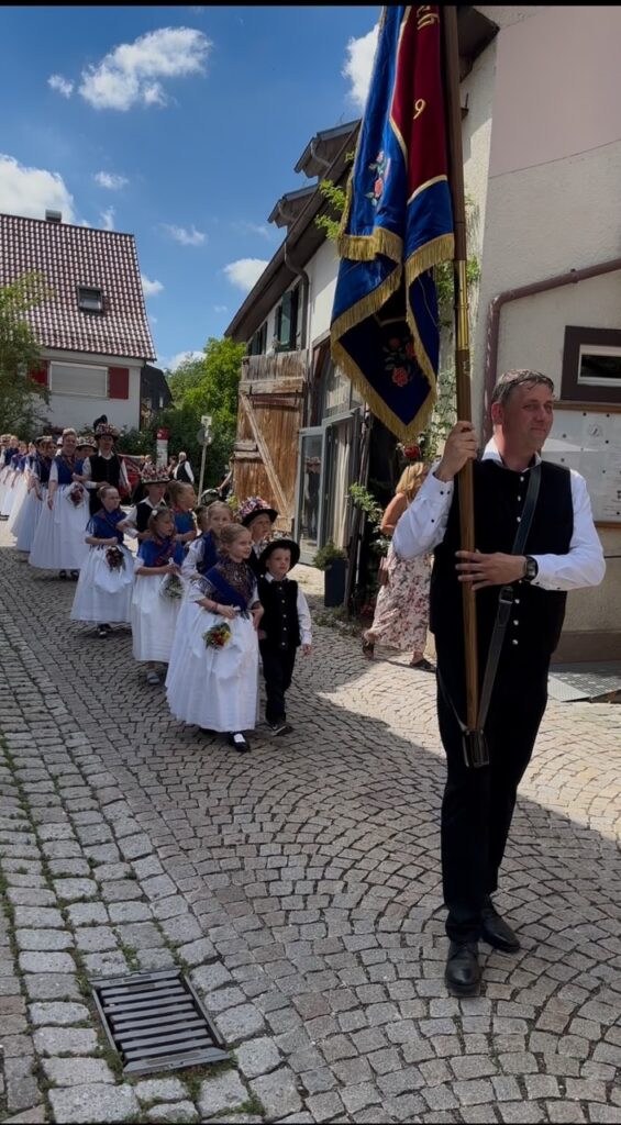 Nach einem festlichen Gottesdienst, der musikalisch von der Bläsergruppe unter der Leitung von Mathias Mittler umrahmt wurde, versammelten sich die Teilnehmer auf dem Kirchplatz. Das Vortänzerpaar lud Pfarrer Stadlbauer und die Kirchengemeinde ein, gemeinsam das Fest zu feiern. Zur Einstimmung spielte die Blaskapelle ein schwungvolles Ständchen.