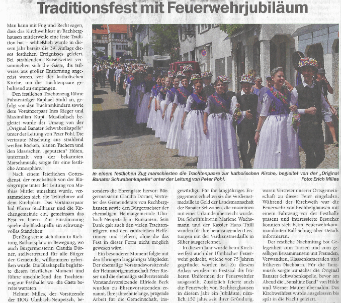 In diesem Jahr wurde beim Kirchweifest auch der Ulmbacher Feuerwehr gedacht, welche vor 75 Jahren gegründet wurde. Zu diesem Anlass wurden im Festsaal die früheren Uniformen der Feuerwehr ausgestellt. Zusätzlich feiert auch die Feuerwehr von Rechberghausen in diesem Jahr ein Jubiläum, nämlich 150 Jahre seit ihrer Gründung. Um die Verbundenheit zu zeigen, waren Vertreter unserer Ortsgemeinschaft zu dieser Feier eingeladen. Während der Kirchweih war die Feuerwehr von Rechberghausen mit einem Fahrzeug vor der Festhalle präsent und interessierte Besucher konnten sich beim Feuerwehrkommandanten Herrn Ralf Schrag über Details informieren.